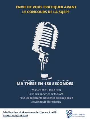 L’activité est ouverte à tous.tes les doctorant.es des programmes de science politique des quatre universités montréalaises (UQAM, UdeM, Concordia et McGill), quel que soit leur niveau d’avancement dans la thèse.